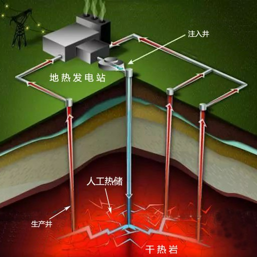 干热岩是埋藏于地下深处,温度大于150℃,不含或含少量流体的致密不渗透的高温热岩体,主要为变质岩或结晶岩类岩体。它们埋藏浅,温度在150℃以上,其热能赋存于岩石中,被认为是极具战略潜力的替代性清洁能源。干热岩也是一种地热资源。但是,干热岩是属于温度大于150℃的高温地热资源,而且其性质和赋存状态有别于蒸汽型、热水型、地压型和岩浆型的地热资源。干热岩的成分可以变化很大,绝大部分为中生代以来的中酸性侵入岩,但也可以是中新生代的变质岩, 甚至是厚度巨大的块状沉积岩。干热岩主要被用来提取其内部的热量, 因此其主要的工业指标是岩体内部的温度。
