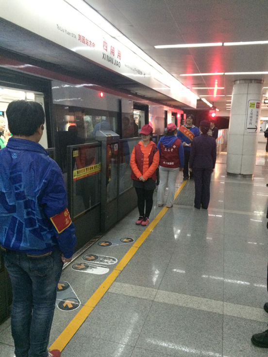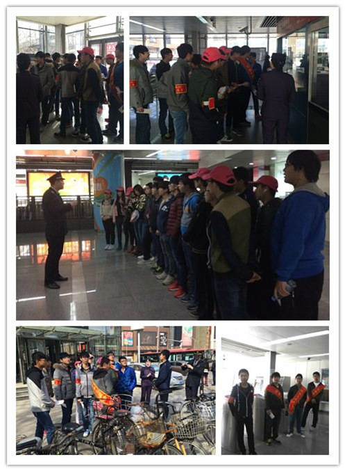 当日下午两点,我班同学在班长董储源,团支书苗立爽的带领下到达西南角地铁站。我们分成两队,在地铁站工作人员的指导帮助下进行学雷锋志愿服务。一队由班长董储源带领,对地铁站内部设施进行清洁,并给有需求的乘客指引方向,协助地铁站工作人员工作。另一队体委成明凯带领,深入了解地铁站的四个出口及周边环境,帮助市民优化乘车路线,并且对地铁站的户外设施进行清洁。
