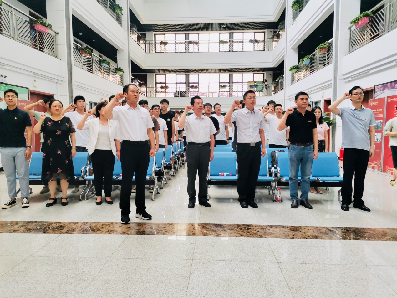 收看直播盛况结束后,bat365中文官方网站集中举行了隆重的新党员入党宣誓和老党员重温入党誓词活动,学院全体党委委员带领新老党员庄严宣誓:“我志愿加入中国共产党,拥护党的纲领,遵守党的章程,履行党员义务……”党员们的庄严宣誓,字字铿锵、句句有声,表达了对党的忠心和为共产主义事业奋斗终身的决心。