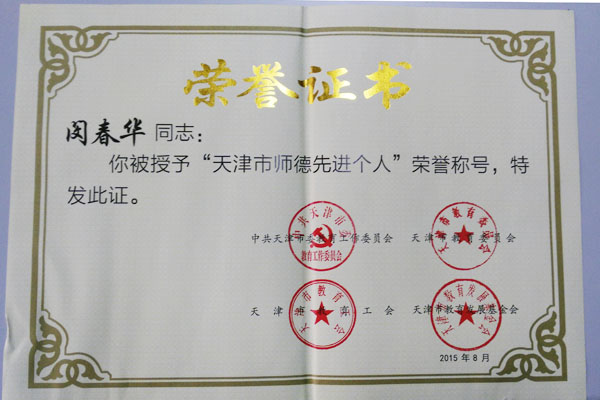 在第31个教师节到来之际,中共天津市委教育工委、天津市教委联合表彰了一批2012年以来在教师职业道德建设和大学生思想政治教育方面做出突出贡献、取得优异成绩的先进个人。bat365官网闵春华教授获“天津市师德先进个人”称号。 此次评选,全市共有300名同志被授予“天津市师德先进个人”荣誉称号。我校共有四名教师获此称号。
