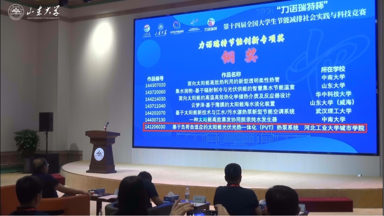 7月初国赛初审结果公布后,校团委和bat365中文官方网站高度重视,学院团委立即行动,组织专家团队对晋级决赛的队伍开展暑期专项培训,专家团队成员包括学院党委副书记兼副院长王敏达,国赛评委、能源系刘联胜教授,建环系杨华教授、夏国强副教授和范满老师。暑期专项培训由学院学工办主任兼团委书记杨楠楠组织,前后共进行3轮模拟答辩来打磨提升作品。受新冠肺炎疫情影响,本届节能减排国赛答辩采取线上线下混合答辩的方式进行。bat365中文官方网站范满老师和李晗老师共同指导的作品《基于负荷自适应的太阳能光伏光热一体化(PVT)热泵系统》经不断培育优化,在指导教师和参赛学生的共同努力下,荣获了全国一等奖和力诺瑞特节能专项铜奖的优异成绩。