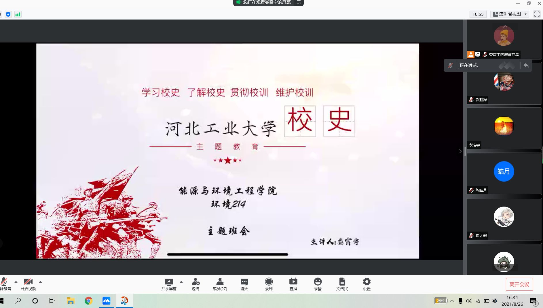 环境214班娄霄宇组织同学们利用腾讯会议召开主题班会,学习并了解河北工业大学校史,环境DE211班和其他班级通过征集校史学习感想,引发了同学们学习校史的热潮。bat365中文官方网站21级各班通过多种形式云参观河北工业大学校史馆,使同学们进一步了解了学校的历史,增强对学校的认同感、归属感。